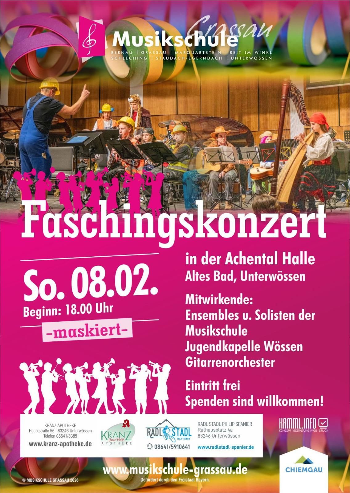 Am Sonntag, den 8. Februar, wird es bunt in der Achental Halle (Altes Bad). Die Musikschule Grassau lädt gemeinsam mit der Jugendkapelle Wössen zum großen Faschingskonzert ein. Ein musikalischer Spaß für die ganze Familie – bei freiem Eintritt!
