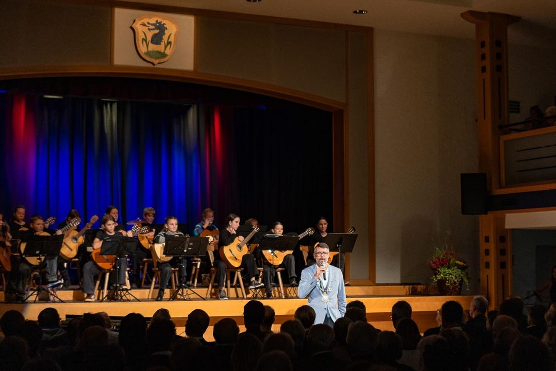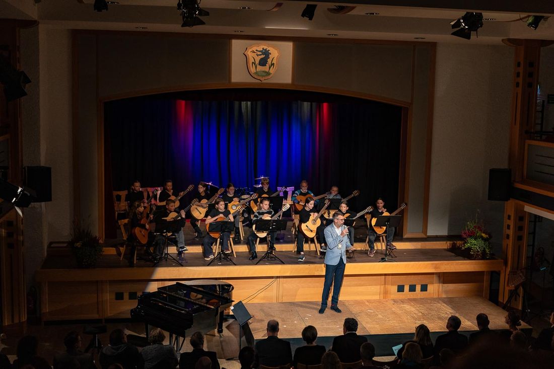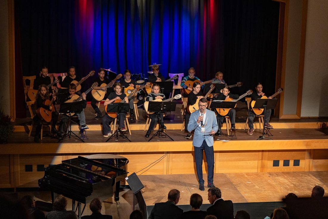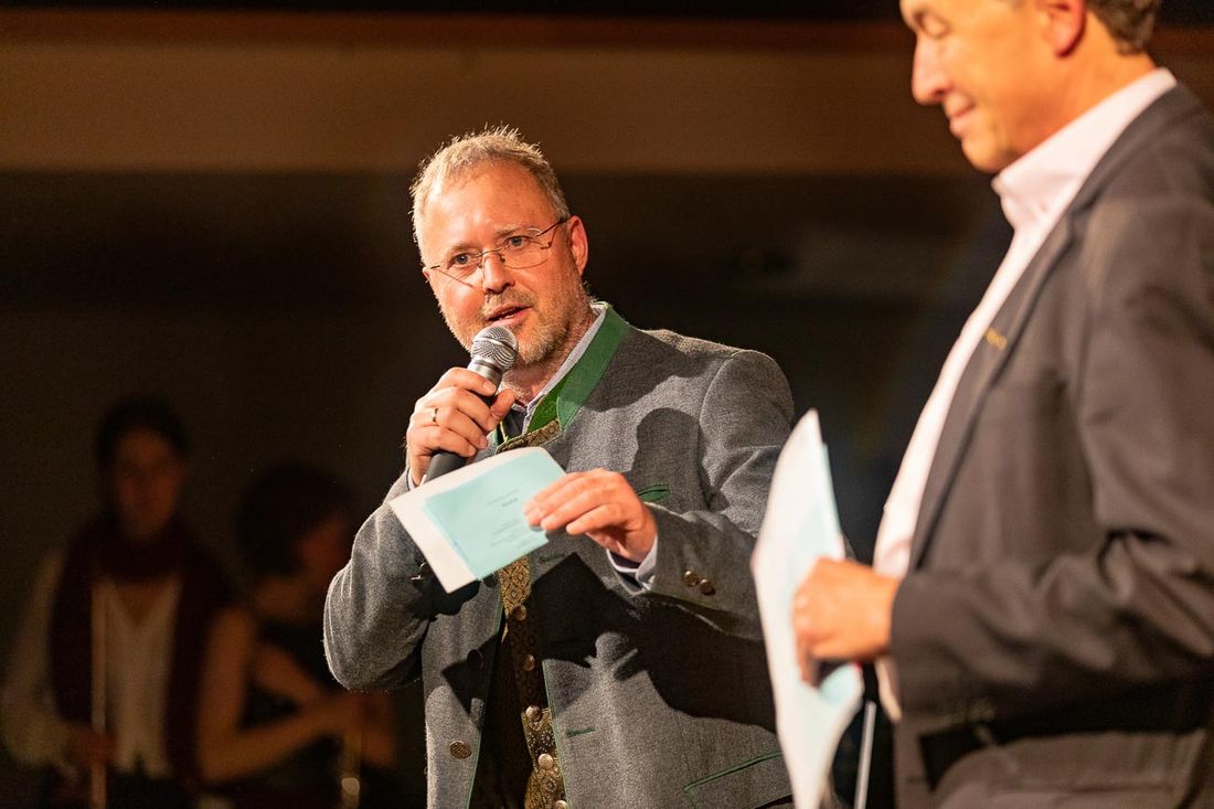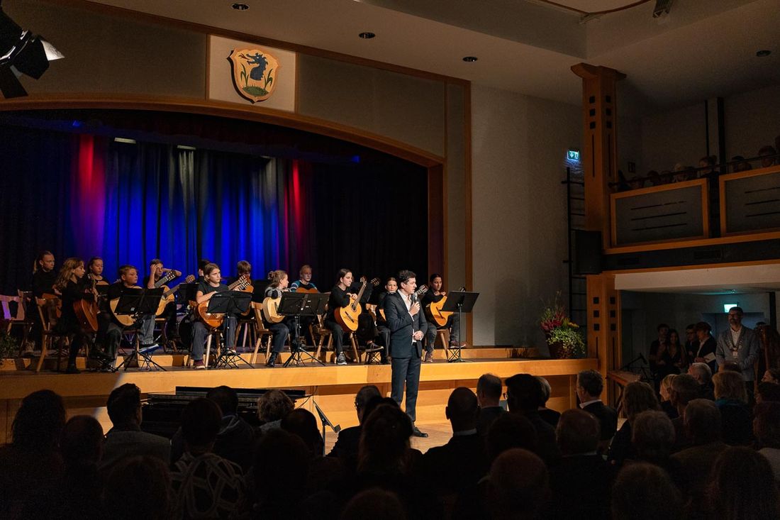 Der Bürgermeister richtete noch einmal das Wort an die Anwesenden, hob die Bedeutung der Musikschule Grassau mit ihren Zweigstellen Bernau, Staudach-Egerndach, Marquartstein, Schleching, Unterwössen und Reit im Winkl erneut hervor und verlieh seiner Freude mit dem Satz Ausdruck „Ich liebe diese Musikschule“ – mehr noch: Er testete sein sängerisches Talent mit dem Udo Jürgens-Lied „Danke für die Blumen“, hier mit den Worten: „Danke für die Musi, danke für den Applaus“. Die Musiker-Profis begleiteten ihn temperamentvoll, und das Publikum ließ sich, lange begeistert klatschend, von ihrer guten Stimmung beschwingt anstecken.