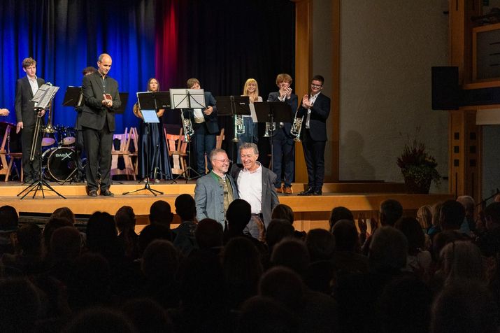 Was dem bis dahin schon eindrucksvollen Konzert die Krone aufsetzte, war der Schluss: Eine Band aus Ehemaligen der Musikschule Grassau, denen die Musik inzwischen zum Beruf geworden war, bot Fabelhaftes. Die „Töchter und Söhne von Grassau“ brachten eine Auftragskomposition von Hans Kröll auf die Bühne und rissen den Saal mit: bestes vergnügtes, schwungvolles Miteinander. Alle Musiker legten sich ins Zeug und ließen die Instrumente jubeln, darunter Stefan Dettl von LaBrassBanda, ein ehemaliger Schüler von Crump und Diem.