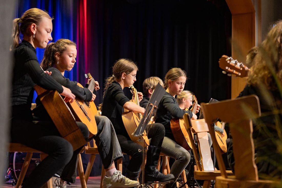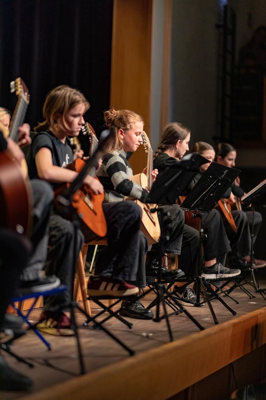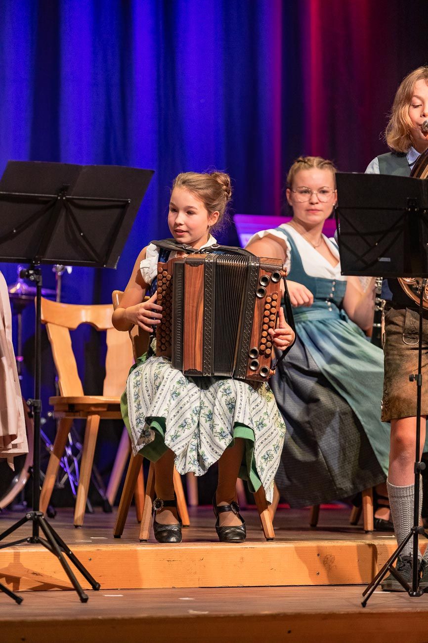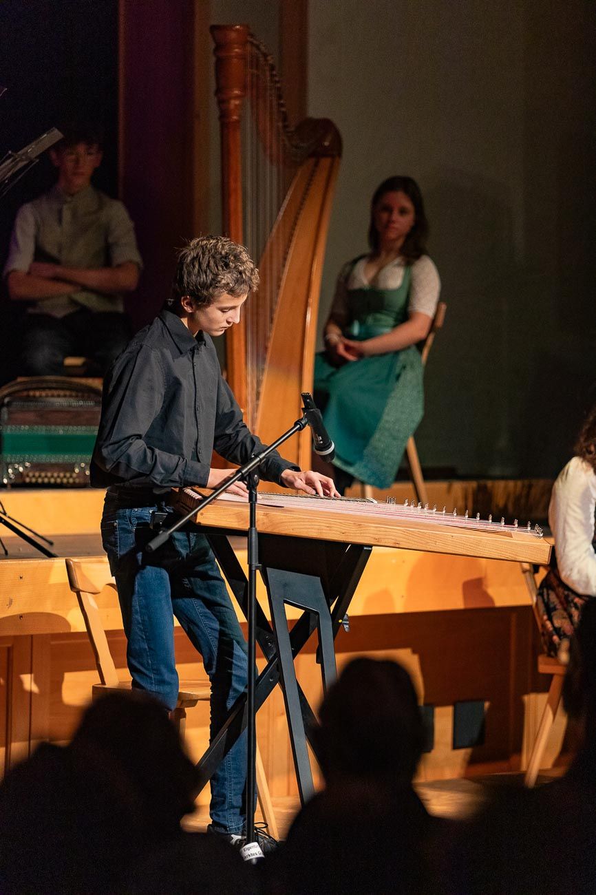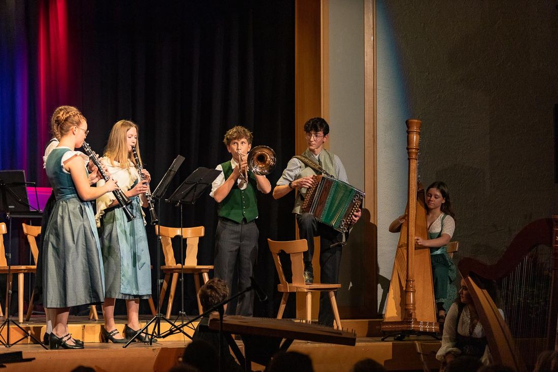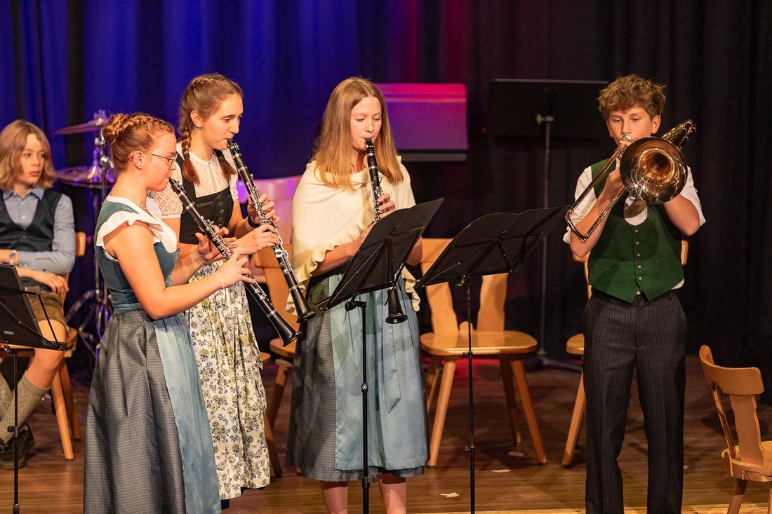 Schmissig traten im Volksmusik-Block die „Fetzigen Fünf“ mit zwei Klarinetten, einem Horn, einem Tenorhorn und einer Diatonischen Harmonika auf: Lena Haumeier, Lotta Würth, Luise Noichl, Lukas Schorr, Louisa Muschalla. An der Zither spielte Max Bodenmeier Solo „Über d’Oima“, die Erkennungsmelodie von „Unter unserm Himmel“ (BR).