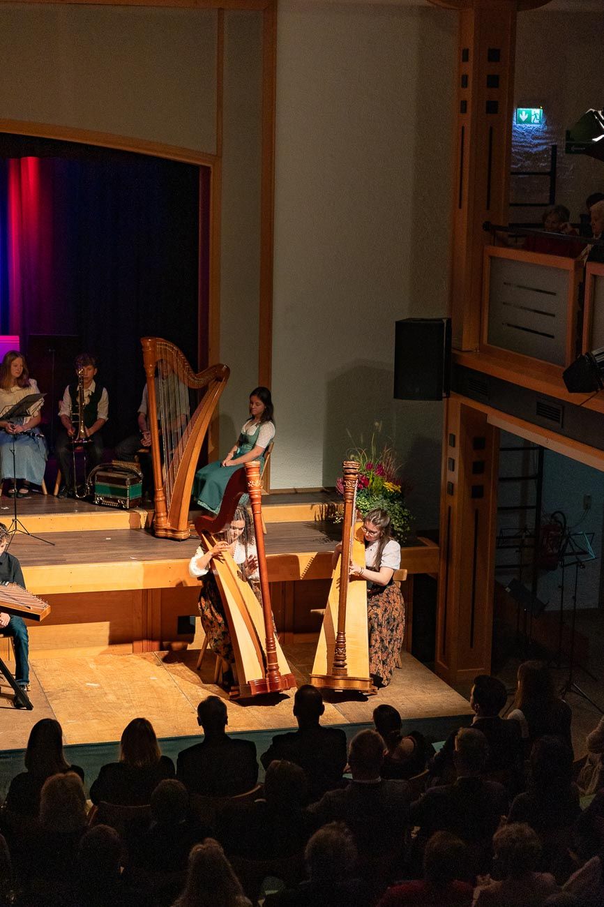 Ausgezeichnet trug das „Heiraffe-Harfenduo“ Katharina Thaurer und Johanna Stein den melodisch-flotten Kirchbichler Bergsteigermarsch vor. Die „Grassauer Klarinettenmusi“ mit drei Klarinetten, einer Posaune, einer Ziach und einer Harfe trat besonders flink auf (Verena Hacher, Franziska Schneider, Isabelle Weiß, Leonhard Lahner, Lukas Auer, Luisa Muschalla).